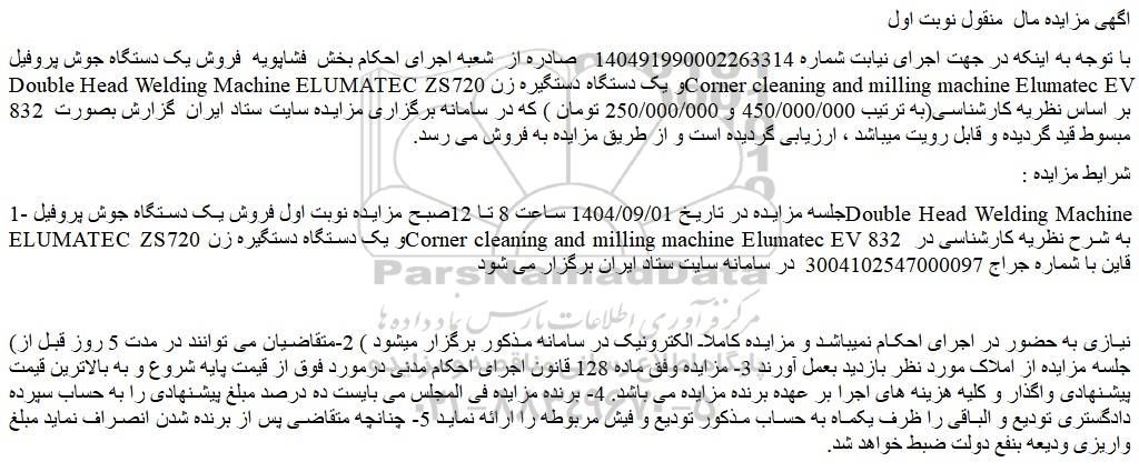 تلفن:5- 88349670 (021) فکس: 88349673 (021) Website: www.ParsNamadData.com E-mail: Info@ParsNamadData.com مزایده فروش یک دستگاه جوش پروفیل double head welding machine elumatec zs720 و ...