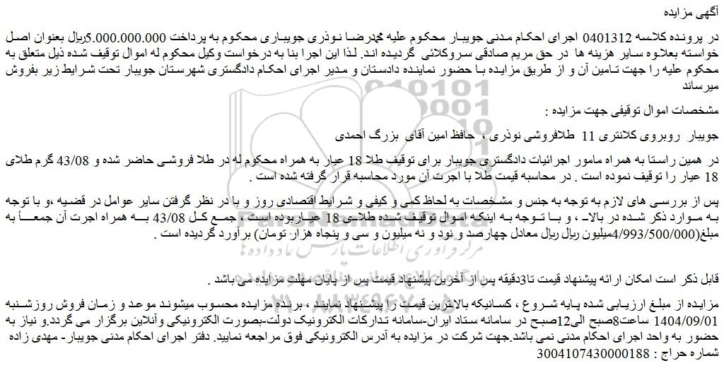 در پرونده کلاسه 0401312 اجرای احکام مدنی جویبار محکوم علیه محمدرضا نوذری جویباری محکوم به پرداخت 5.000.000.000ریال بعنوان اصل خواسته بعلاوه سایر هزینه ها  در حق مریم صادقی سروکلائی  گردیده اند. لذا این اجرا بنا به درخواست وکیل محکوم له اموال توقیف شده ذیل متعلق به محکوم علیه را جهت تامین آن و از طریق مزایده با حضور نماینده دادستان و مدیر اجرای احکام دادگستری شهرستان جویبار تحت شرایط زیر بفروش میرساند