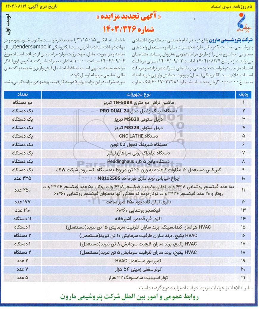 تلفن:5- 88349670 (021) فکس: 88349673 (021) Website: www.ParsNamadData.com E-mail: Info@ParsNamadData.com مزایده تجهیزات مازاد و مستعمل واحدهای تعمیراتی ... تجدید