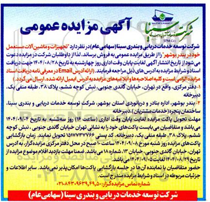 شرکت توسعه خدمات دریایی و بندری سینا (سهامی عام) در نظر دارد تجهیزات و ماشین آلات مستعمل خود در بندر بوشهر را از طریق مزایده عمومی به فروش رساند . لذا از داوطلبان شرکت در مزایده دعوت میشود از تاریخ انتشار آگهی لغایت پایان وقت اداری روز چهارشنبه به تاریخ 1404.08.28 جهت دریافت اسناد و شرایط مزایده به آدرس های ذیل مراجعه فرمایند.