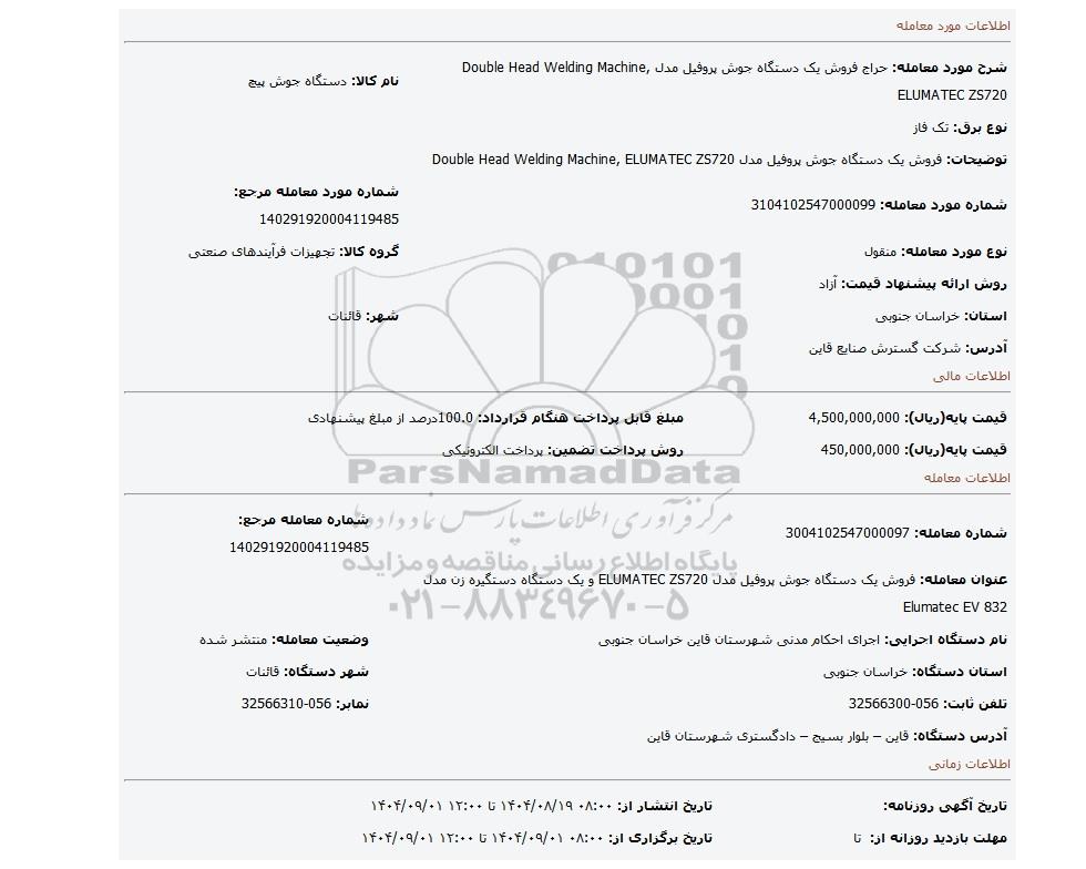 | عنوان آگهی: مزایده فروش یک دستگاه جوش پروفیل مدل Double Head Welding Machine ELUMATEC ZS720 |
