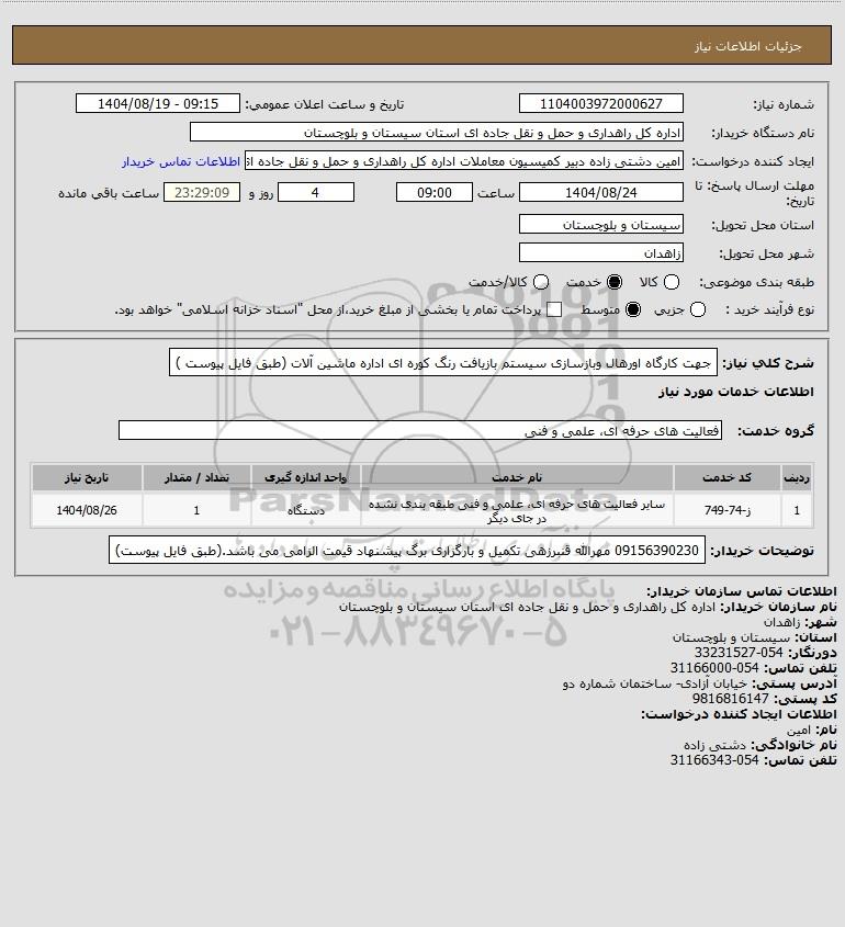 تلفن:5- 88349670 (021) فکس: 88349673 (021) Website: www.ParsNamadData.com E-mail: Info@ParsNamadData.com استعلام جهت کارگاه اورهال وبازسازی سیستم بازیافت رنگ کوره ای اداره ماشین آلات (طبق فایل پیوست )