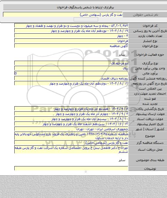 تلفن:5- 88349670 (021) فکس: 88349673 (021) Website: www.ParsNamadData.com E-mail: Info@ParsNamadData.com مناقصه مناقصه شماره ۳۵-۱۴۰۴-۱۳۳۶ تامین و راهبری یک فروند بارج مسکونی خودبالابر پایه دار با ارایه خدمات سکون