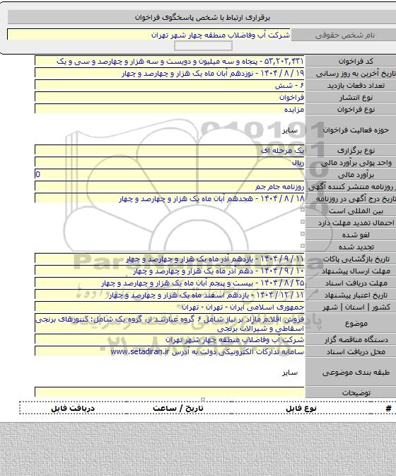 تلفن:5- 88349670 (021) فکس: 88349673 (021) Website: www.ParsNamadData.com E-mail: Info@ParsNamadData.com مزایده فروش اقلام مازاد بر نیاز شامل ۶ گروه عبارتند از گروه یک شامل: کنتورهای برنجی اسقاطی و شیرآلات برنجی