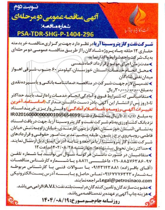 شرکت نفت و گاز پتروسینا آریا در نظر دارد جهت برگزاری مناقصه خریدمته حفاری 12 حلقه چاه پروژه شادگان را از طریق مناقصه عمومی دو مرحله ای به یک شرکت واجد شرایط واگذار نماید.