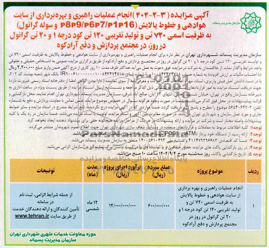 سازمان مدیریت پسماند شهرداری تهران در نظر دارد برای انجام عملیات راهبری و بهره برداری از سایت هوادهی و خطوط پالایش به ظرفیت اسمی 720 تن و تولید تقریبی 120 تن کود درجه 1 و 20 تن گرانول در روز در مجتمع پردازش و دفع آراد کوه از طریق برگزاری مزایده عمومی به اشخاص حقیقی و حقوقی واجد شرایط واگذار نماید از علاقمندان به شرکت در مزایده فوق دعوت به عمل می آید حداکثر ظرف مدت 10 روز کاری از درج آگهی ضمن واریز مبلغ 2.200.000 ریال با احتساب مالیات بر ارزش افزوده به شماره حساب 100843474718 و یا شماره شبای ir900610000000100843474718 بانک شهر شعبه بهشت کد 202 با در دست داشتن اصل فیش واریزی اسناد مهر و اطلاعات کامل شرکت و معرفی نامه از سوی نماینده ) دارا بودن گواهی امضا از دفترخانه اسناد رسمی ضرورت دارد جهت دریافت اسناد مزایده به امور قراردادهای سازمان به نشانی ذیل الذکر مراجعه و نسبت به ارسال اسناد مزایده از طریق پست ویژه در ساعت اداری به دبیرخانه سازمان واقع در تهران خیابان شهید رجایی انتهای 13 آبان صالح آباد شرقی سازمان مدیریت پسماند شهرداری تهران اقدام نمایند. محل بازگشایی و قرائت پیشنهادات در محل فوق الذکر میباشد. ضمنا در صورت وجود هر گونه سوال در خصوص موضوع مزایده ضمن تماس با معاونت پردازش و دفع به شماره تلفن:3-56540642 موضوع را مطرح و پاسخ لازم دریافت گردد ضمنا مواردی که در آگهی مزایده درج نگردیده تابع شرایط مندرج در اسناد مزایده و سایر ضوابط جاری و مورد عمل سازمان و شهرداری تهران میباشد در صورت مغایرت بین آگهی و اسناد مزایده اولویت با اسناد مزایده میباشد. ضمنا سازمان در رد یک یا کلیه پیشنهادات واصله مختار است و شرکت در مزایده و ارائه پیشنهادات در هر یک از مراحل مزایده هیچگونه حقی برای پیشنهاد دهنده ایجاد نخواهد کرد.