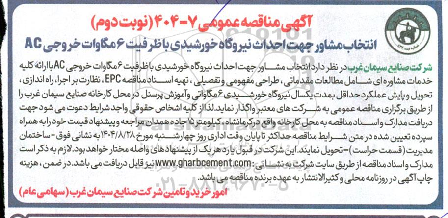 شرکت صنایع سیمان غرب در نظر دارد انتخاب مشاور جهت احداث نیروگاه خورشیدی با ظرفیت 6 مگاوات خروجی AC با ارائه کلیه خدمات مشاوره ای شامل مطالعات مقدماتی، طراحی مفهومی و تفصیلی ، تهیه اسناد مناقصه EPC ، نظارت بر اجرا راه اندازی تحویل و پایش عملکرد حداقل بمدت یکسال نیروگاه خورشیدی 6 مگاواتی و آموزش پرسنل در محل کارخانه صنایع سیمان غرب را از طریق برگزاری مناقصه عمومی به شرکت های معتبر واگذار نماید. لذا از کلیه اشخاص حقوقی واجد شرایط دعوت میشود جهت دریافت مدارک و اسناد مناقصه به محل کارخانه واقع در کرمانشاه، کیلومتر 15 جاده همدان مراجعه و پیشنهاد قیمت خود را به همراه سپرده تعیین شده در متن شرایط مناقصه حداکثر تا پایان وقت اداری روز 4شنبه مورخ 1404.8.28 به نشانی فوق - ساختمان مدیریت (قسمت حراست) - تحویل نمایند. این شرکت در قبول یا رد هر یک از پیشنهادهای واصله مختار خواهد بود. لازم به ذکر است مدارک و اسناد مناقصه از طریق سایت شرکت به نشانی www.gharbcement.com نیز قابل دریافت میباشد. در ضمن هزینه چاپ آگهی در روزنامه محلی و کثیر الانتشار به عهده برنده مناقصه می باشد.