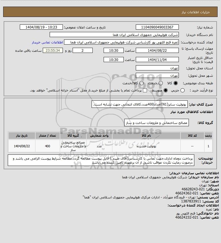تلفن:5- 88349670 (021) فکس: 88349673 (021) Website: www.ParsNamadData.com E-mail: Info@ParsNamadData.com استعلام یونولیت سایز(N1)تعداد400عددکالای انتخابی جهت تشابه است.