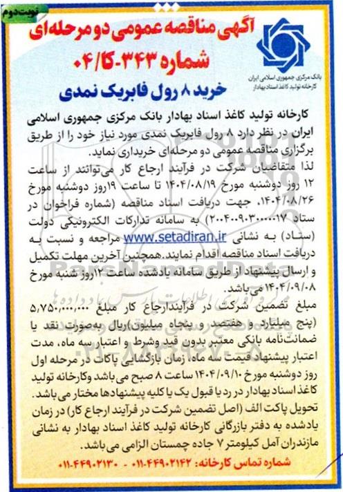 کارخانه تولید کاغذ اسناد بهادار بانک مرکزی جمهوری اسلامی ایران در نظر دارد 8 رول فابریک نمدی مورد نیاز خود را از طریق برگزاری مناقصه عمومی دو مرحله ای خریداری نماید.
