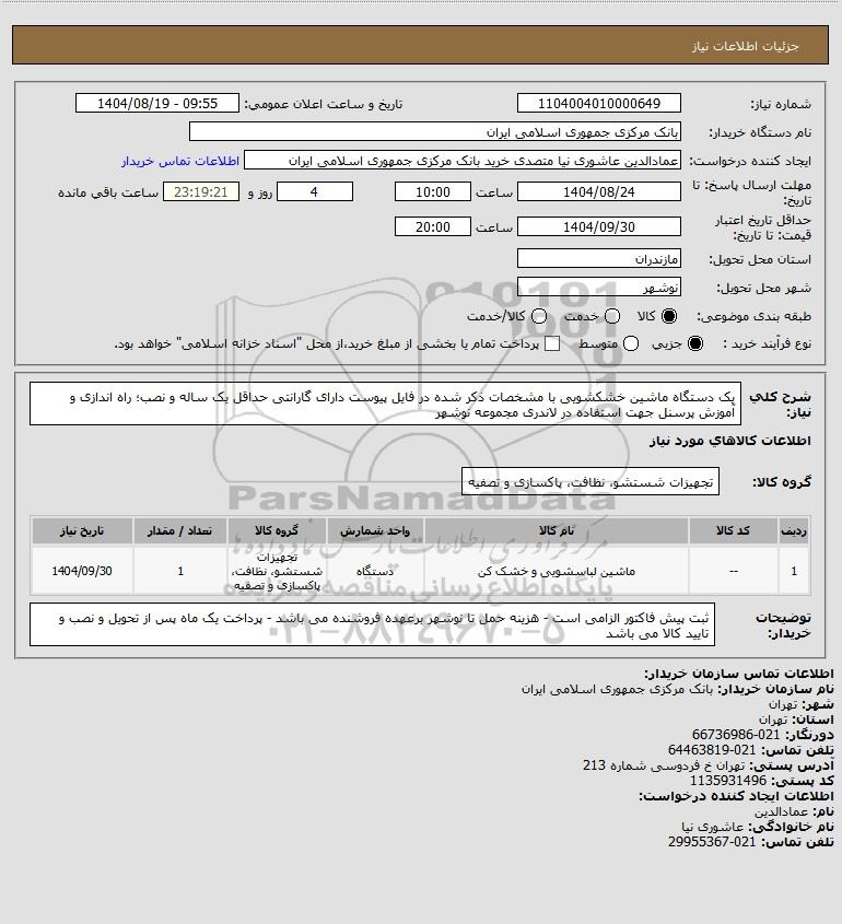 تلفن:5- 88349670 (021) فکس: 88349673 (021) Website: www.ParsNamadData.com E-mail: Info@ParsNamadData.com استعلام یک دستگاه ماشین خشکشویی با مشخصات ذکر شده در فایل پیوست دارای گارانتی حداقل یک ساله و نصب؛ راه اندازی و آموزش پرسنل جهت استفاده در لاندری مجموعه نوشهر