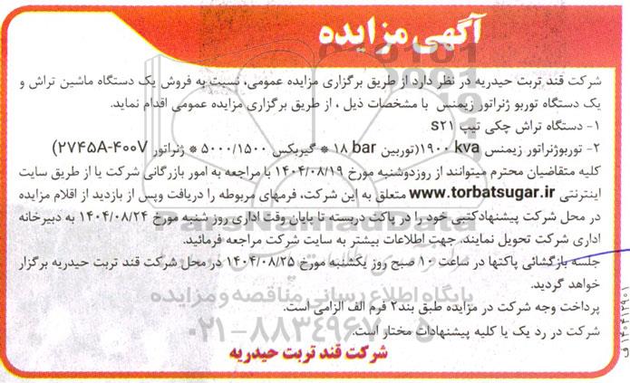 تلفن:5- 88349670 (021) فکس: 88349673 (021) Website: www.ParsNamadData.com E-mail: Info@ParsNamadData.com مزایده فروش یک دستگاه ماشین تراش و یک دستگاه توربو ژنراتور زیمنس
