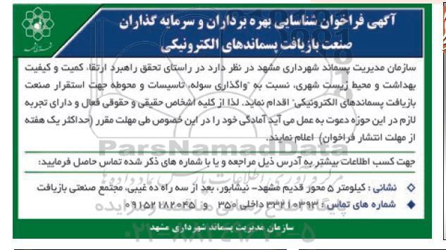 تلفن:5- 88349670 (021) فکس: 88349673 (021) Website: www.ParsNamadData.com E-mail: Info@ParsNamadData.com آگهی فراخوان شناسایی بهره برداران و سرمایه گذاران صنعت بازیافت پسماندهای الکترونیکی