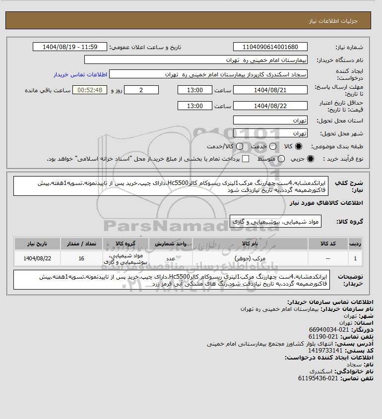 تلفن:5- 88349670 (021) فکس: 88349673 (021) Website: www.ParsNamadData.com E-mail: Info@ParsNamadData.com استعلام ایرانکدمشابه.4ست چهاررنگ مرکب1لیتری ریسوکام کالرHc5500.دارای چیپ.خرید پس از تاییدنمونه.تسویه1هفته.پیش فاکتورضمیمه گردد.به تاریخ نیازدقت شود