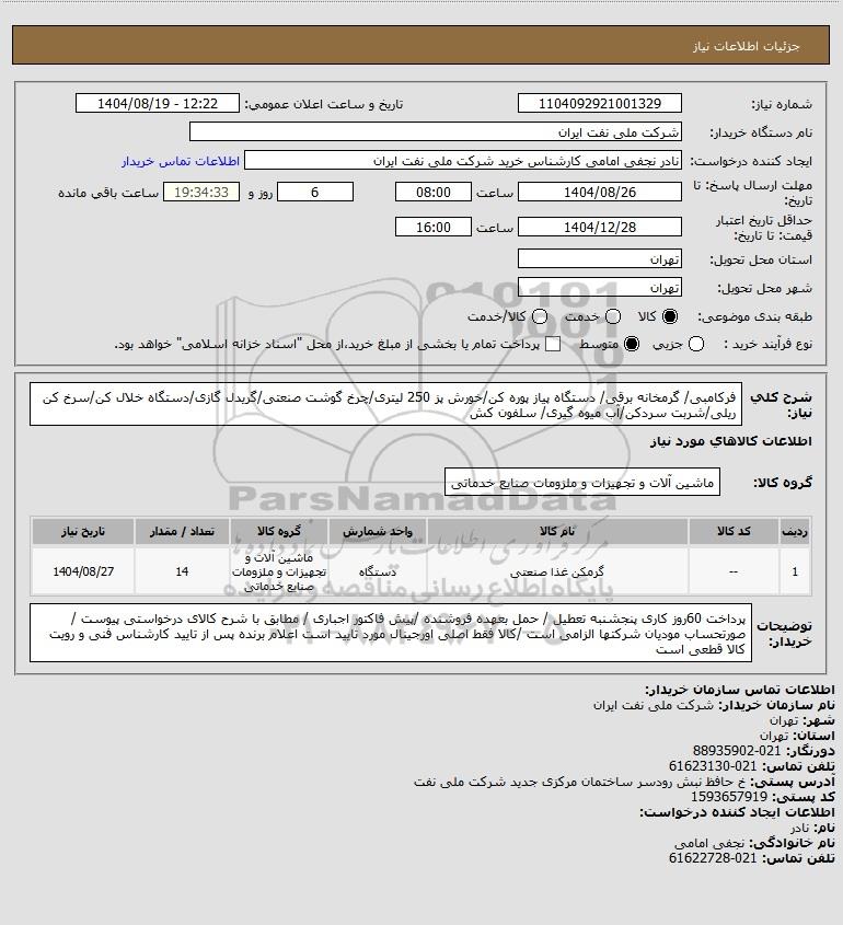 تلفن:5- 88349670 (021) فکس: 88349673 (021) Website: www.ParsNamadData.com E-mail: Info@ParsNamadData.com استعلام فرکامبی/ گرمخانه برقی/ دستگاه پیاز پوره کن/خورش پز 250 لیتری/چرخ گوشت صنعتی/گریدل گازی/دستگاه خلال کن/سرخ کن ریلی/شربت سردکن/آب میوه گیری/ سلفون کش