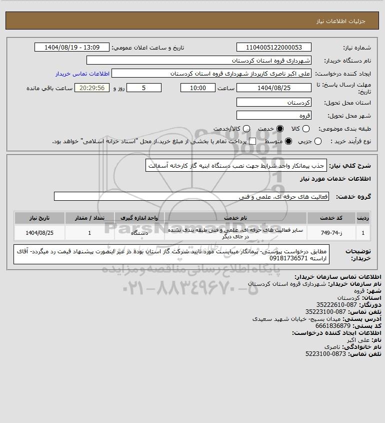 شرح کلی نیاز: جذب پیمانکار واجد شرایط جهت نصب دستگاه ابنیه گاز کارخانه آسفالت