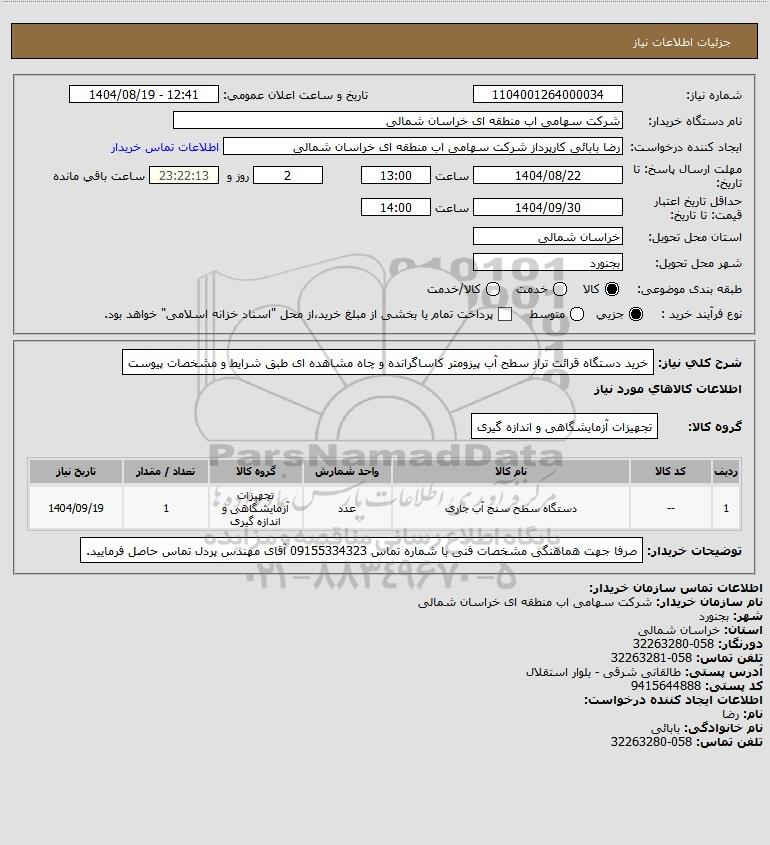 تلفن:5- 88349670 (021) فکس: 88349673 (021) Website: www.ParsNamadData.com E-mail: Info@ParsNamadData.com استعلام خرید دستگاه قرائت تراز سطح آب پیزومتر کاساگرانده و چاه مشاهده ای طبق شرایط و مشخصات پیوست