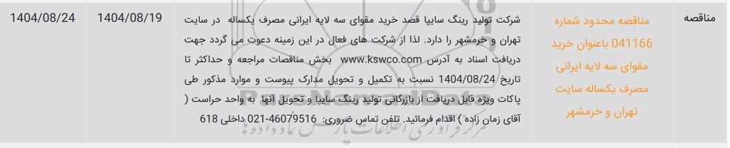 تلفن:5- 88349670 (021) فکس: 88349673 (021) Website: www.ParsNamadData.com E-mail: Info@ParsNamadData.com مناقصه خرید مقوای سه لایه ایرانی مصرف یکساله سایت ..