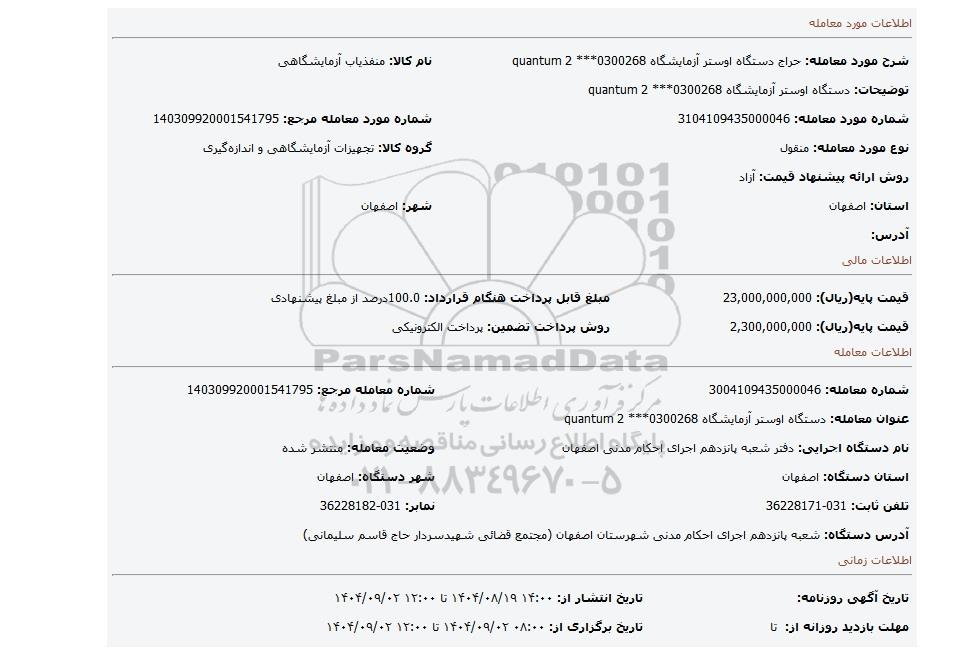 | عنوان آگهی: مزایده دستگاه اوستر آزمایشگاه quantum 2 ***0300268 |