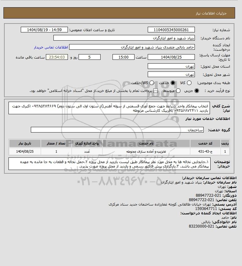 تلفن:5- 88349670 (021) فکس: 88349673 (021) Website: www.ParsNamadData.com E-mail: Info@ParsNamadData.com استعلام انتخاب پیمانکار واجد شرایط جهت جمع آوری قسمتی از سوله آهنی(از ستون اول الی ستون دوم)