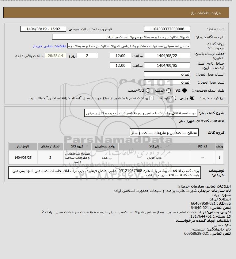 تلفن:5- 88349670 (021) فکس: 88349673 (021) Website: www.ParsNamadData.com E-mail: Info@ParsNamadData.com استعلام درب لمسه اتاق جلسات با جنس چرم به همراه نصب درب و قفل ریموتی
