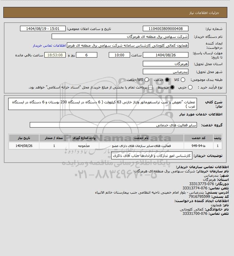 تلفن:5- 88349670 (021) فکس: 88349673 (021) Website: www.ParsNamadData.com E-mail: Info@ParsNamadData.com استعلام عملیات "تعویض و نصب ترانسفورماتور ولتاژ خازنی 63 کیلوولت ( 6 دستگاه در ایستگاه 230 بوستان و 6 دستگاه در ایستگاه غرب )