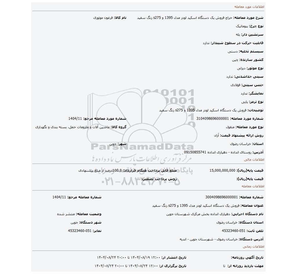| عنوان آگهی: مزایده فروش یک دستگاه اسکید لودر مدل 1395 و s275 رنگ سفید |