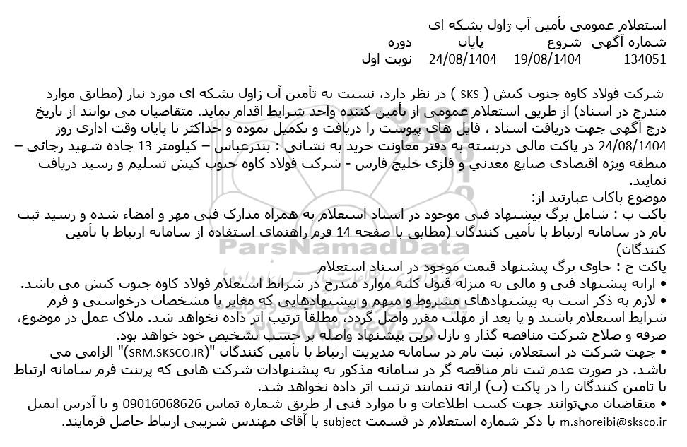 شرکت فولاد کاوه جنوب کیش (SKS) در نظر دارد نسبت به تأمین آب ژاول بشکه ای مورد نیاز مطابق موارد مندرج در استاد از طریق استعلام عمومی از تأمین کننده واجد شرایط اقدام نماید. متقاضیان میتوانند از تاریخ درج آگهی جهت دریافت اسناد ، فایلهای پیوست را دریافت و تکمیل نموده و حداکثر تا پایان وقت اداری مورخ 1404.8.24 در دو پاکت فنی و مالی در بسته به دفتر معاونت خرید به نشانی : بندرعباس - کیلومتر 13 جاده شهید رجائی - منطقه ویژه اقتصادی صنایع معدنی و فلزی خلیج فارس - شرکت فولاد کاوه جنوب کیش تسلیم و رسید دریافت نمایند.