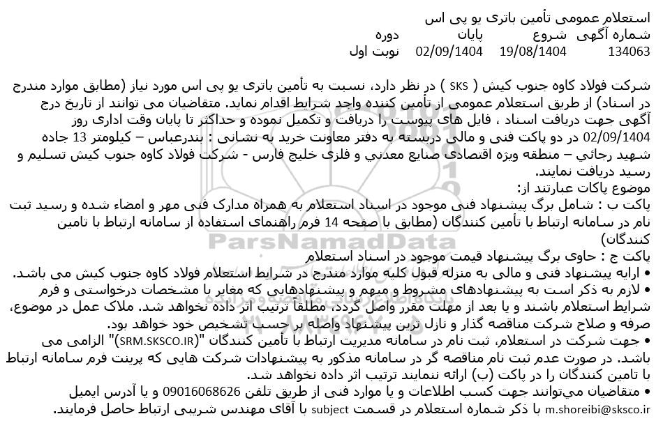 شرکت فولاد کاوه جنوب کیش (SKS) در نظر دارد نسبت به تأمین باتری یو پی اس مورد نیاز مطابق موارد مندرج در استاد از طریق استعلام عمومی از تأمین کننده واجد شرایط اقدام نماید. متقاضیان میتوانند از تاریخ درج آگهی جهت دریافت اسناد ، فایلهای پیوست را دریافت و تکمیل نموده و حداکثر تا پایان وقت اداری مورخ 1404.9.2 در دو پاکت فنی و مالی در بسته به دفتر معاونت خرید به نشانی : بندرعباس - کیلومتر 13 جاده شهید رجائی - منطقه ویژه اقتصادی صنایع معدنی و فلزی خلیج فارس - شرکت فولاد کاوه جنوب کیش تسلیم و رسید دریافت نمایند.