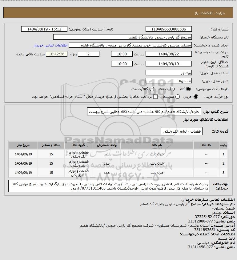 تلفن:5- 88349670 (021) فکس: 88349673 (021) Website: www.ParsNamadData.com E-mail: Info@ParsNamadData.com استعلام خازن/پالایشگاه هفتم/نام کالا مشابه می باشد/کالا مطابق شرح پیوست