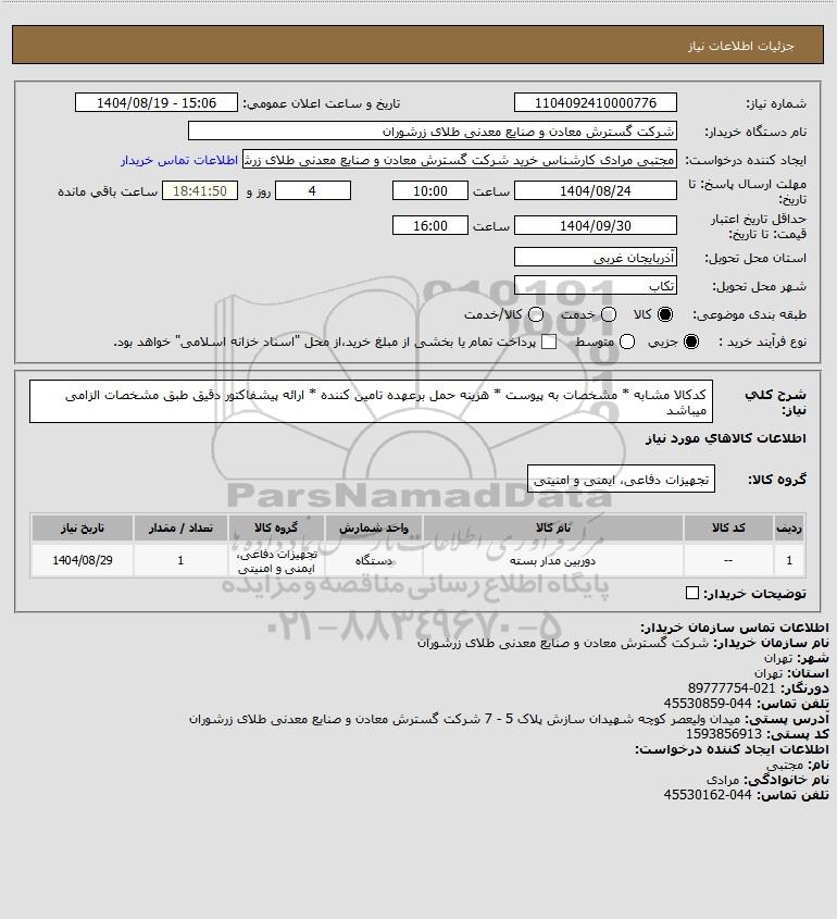 نام دستگاه خریدار:شرکت گسترش معادن و صنایع معدنی طلای زرشوران