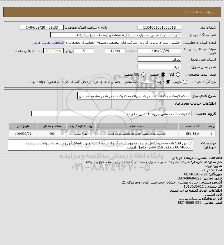 تلفن:5- 88349670 (021) فکس: 88349673 (021) Website: www.ParsNamadData.com E-mail: Info@ParsNamadData.com استعلام اعلام قیمت جهت اسکان نفر-شب برای مدت یکسال در شهر مشهد مقدس