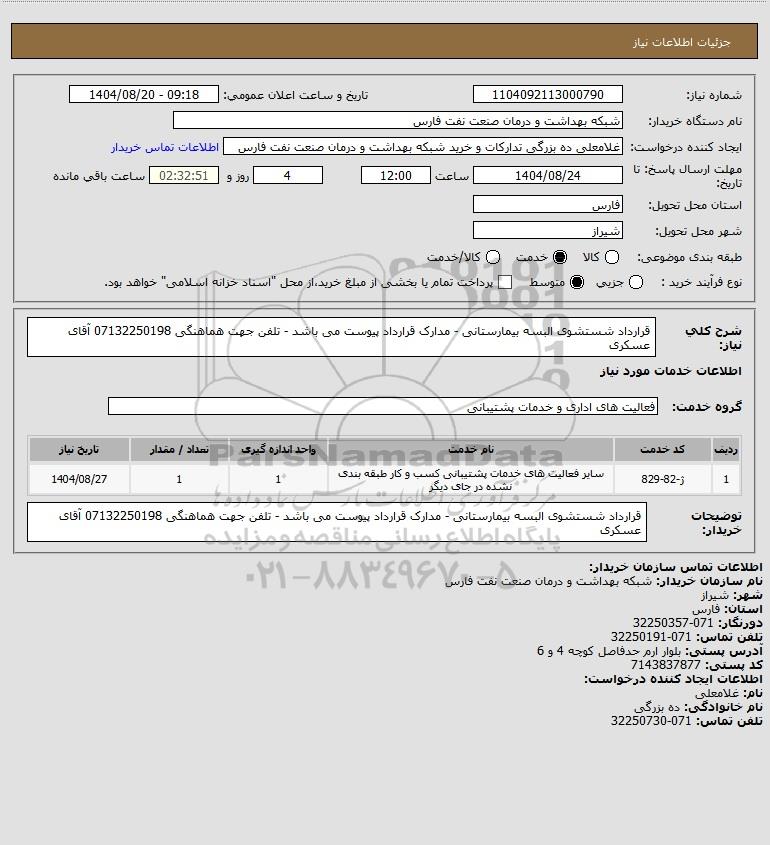 تلفن:5- 88349670 (021) فکس: 88349673 (021) Website: www.ParsNamadData.com E-mail: Info@ParsNamadData.com استعلام قرارداد شستشوی البسه بیمارستانی - مدارک قرارداد پیوست می باشد - تلفن جهت هماهنگی 07132250198 آقای عسکری