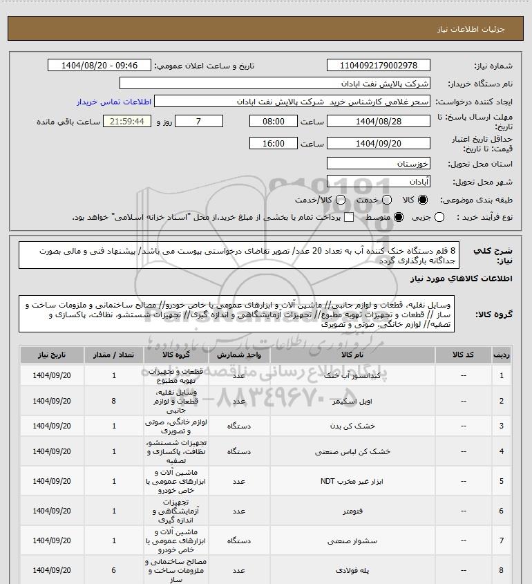 تلفن:5- 88349670 (021) فکس: 88349673 (021) Website: www.ParsNamadData.com E-mail: Info@ParsNamadData.com استعلام 8 قلم دستگاه خنک کننده آب به تعداد 20 عدد/ تصویر تقاضای درخواستی پیوست می باشد/ پیشنهاد فنی و مالی بصورت جداگانه بارگذاری گردد