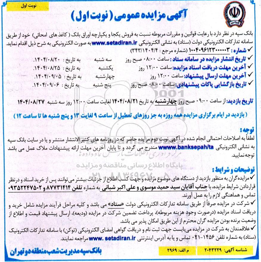آگهی گزار بانک سپه مدیریت شعب منطقه دو تهران