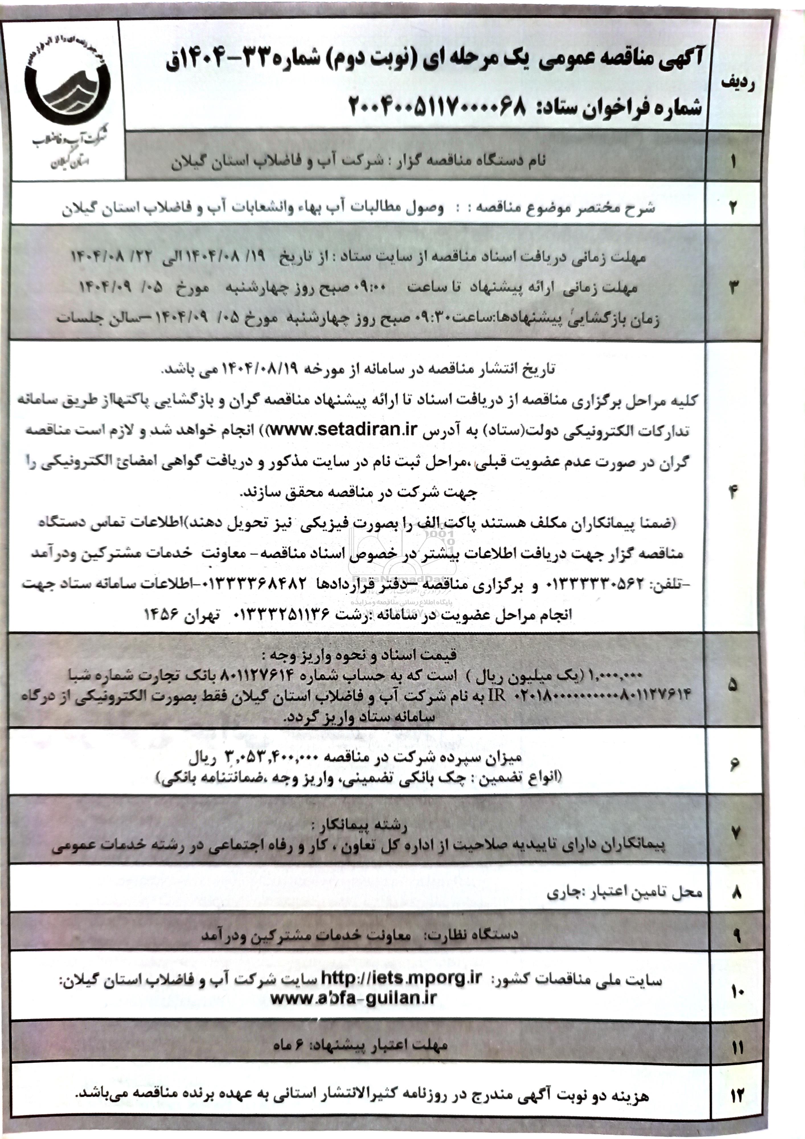 آگهی گزار شرکت آب و فاضلاب استان گیلان