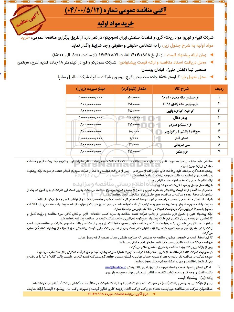 شرکت تهیه و توزیع مواد ریخته گری و قطعات صنعتی ایران سودیکو در نظر دارد از طریق برگزاری مناقصه عمومی خرید