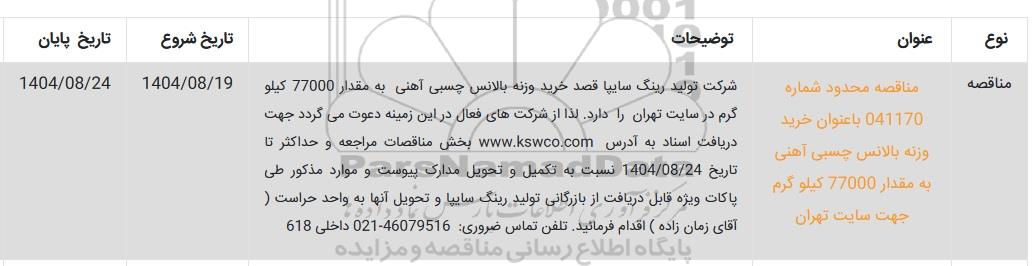 تلفن:5- 88349670 (021) فکس: 88349673 (021) Website: www.ParsNamadData.com E-mail: Info@ParsNamadData.com مناقصه خرید وزنه بالانس چسبی آهنی به مقدار 77000 کیلوگرم