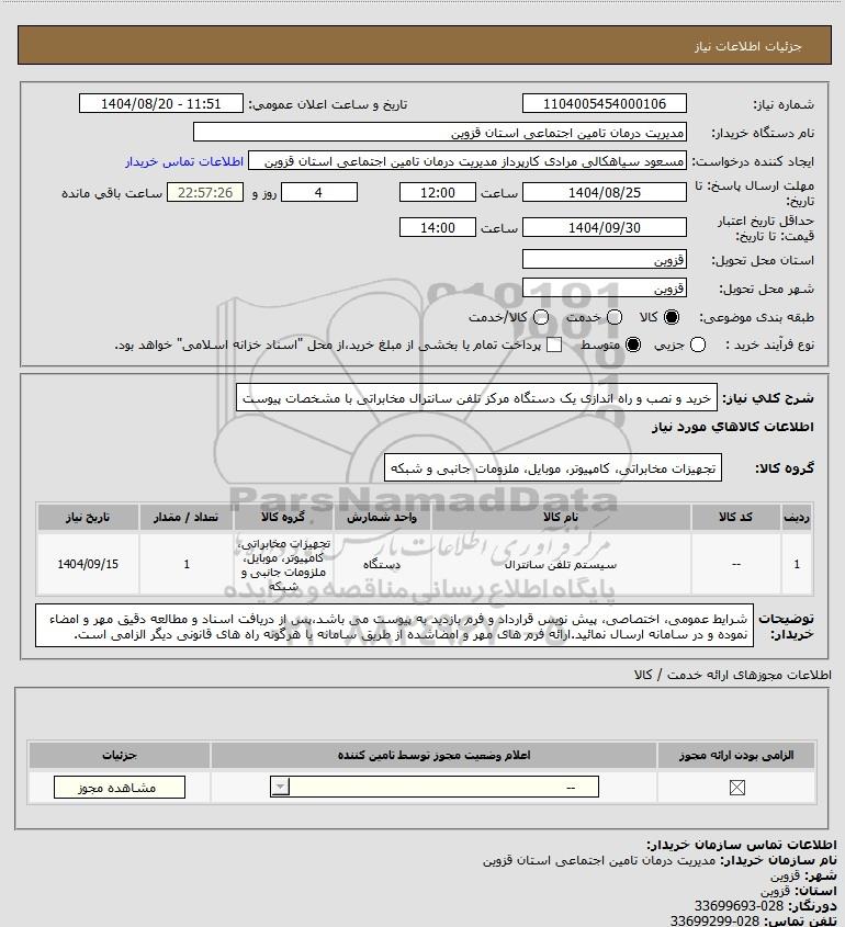 تلفن:5- 88349670 (021) فکس: 88349673 (021) Website: www.ParsNamadData.com E-mail: Info@ParsNamadData.com استعلام خرید و نصب و راه اندازی یک دستگاه مرکز تلفن سانترال مخابراتی با مشخصات پیوست