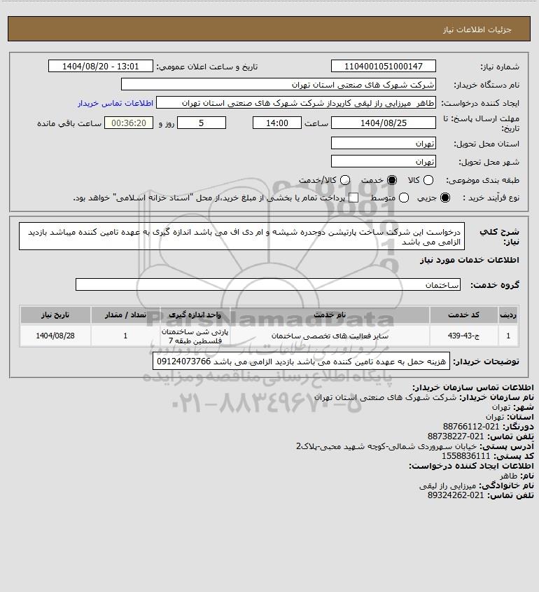 تلفن:5- 88349670 (021) فکس: 88349673 (021) Website: www.ParsNamadData.com E-mail: Info@ParsNamadData.com استعلام درخواست این شرکت ساخت پارتیشن دوجدره شیشه و ام دی اف می باشد اندازه گیری به عهده تامین کننده میباشد بازدید الزامی می باشد