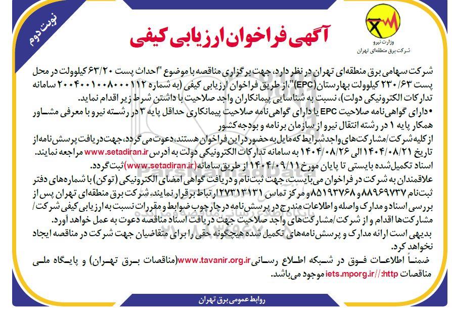 شرکت سهامی برق منطقه ای تهران در نظر دارد جهت برگزاری مناقصه با موضوع احداث پست 63.20 کیلوولت در محل پست 230.63 کیلوولت بهارستان (EPC) از طریق فراخوان ارزیابی کیفی به شماره 2004001008000112 سامانه تدارکات الکترونیکی دولت نسبت به شناسایی پیمانکاران واجد صلاحیت با داشتن شرط زیر اقدام نماید.