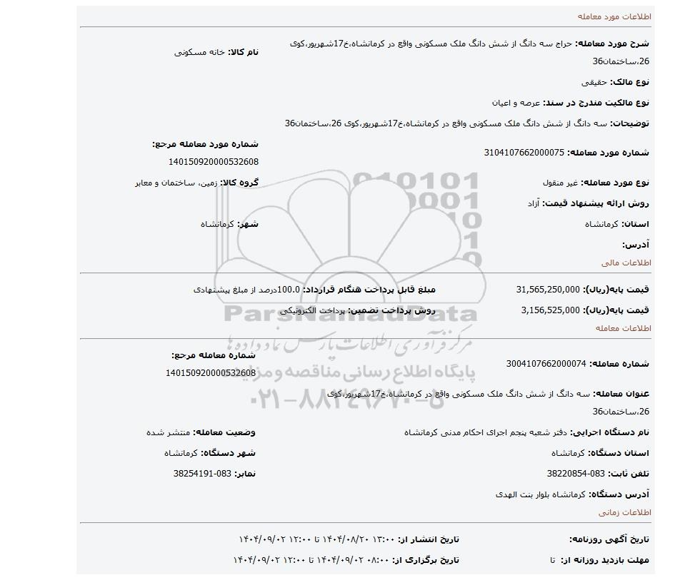 مزایده سه دانگ از شش دانگ ملک مسکونی واقع در کرمانشاهخ17شهریورکوی 26ساختمان36