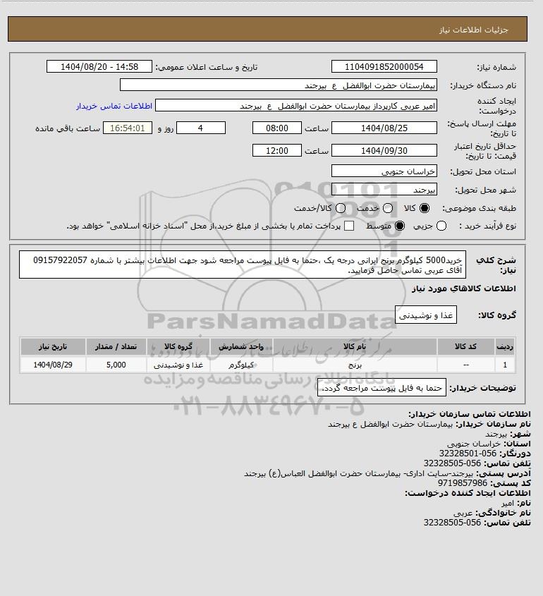 تلفن:5- 88349670 (021) فکس: 88349673 (021) Website: www.ParsNamadData.com E-mail: Info@ParsNamadData.com استعلام خرید5000 کیلوگرم برنج ایرانی درجه یک حتما به فایل پیوست مراجعه شود جهت اطلاعات بیشتر با شماره 09157922057 آقای عربی تماس حاصل فرمایید.