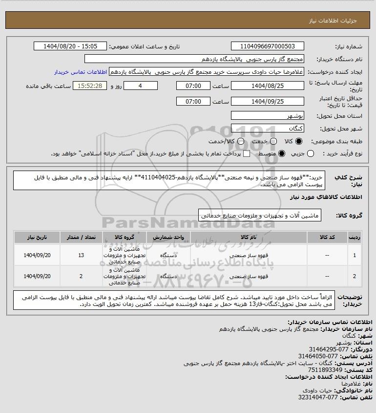 تلفن:5- 88349670 (021) فکس: 88349673 (021) Website: www.ParsNamadData.com E-mail: Info@ParsNamadData.com استعلام خرید:**قهوه ساز صنعتی و نیمه صنعتی**پالایشگاه یازدهم-4110404025** ارایه پیشنهاد فنی و مالی منطبق با فایل پیوست الزامی می باشد.