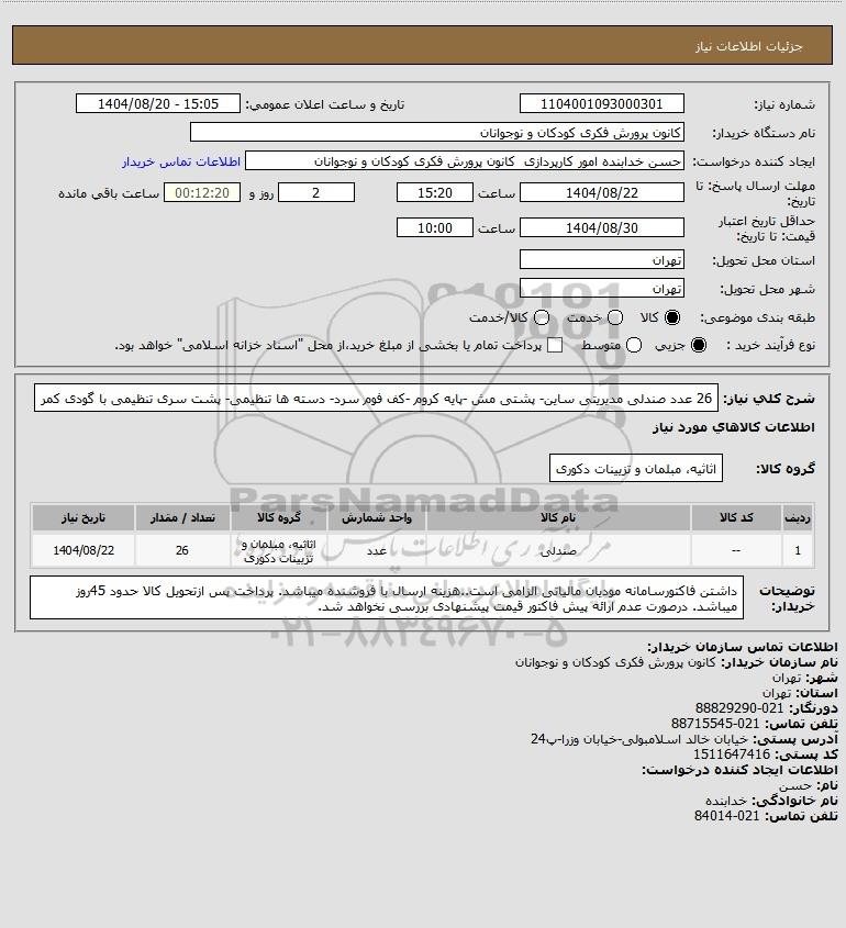تلفن:5- 88349670 (021) فکس: 88349673 (021) Website: www.ParsNamadData.com E-mail: Info@ParsNamadData.com استعلام 26 عدد صندلی مدیریتی ساین- پشتی مش -پایه کروم -کف فوم سرد- دسته ها تنظیمی- پشت سری تنظیمی با گودی کمر