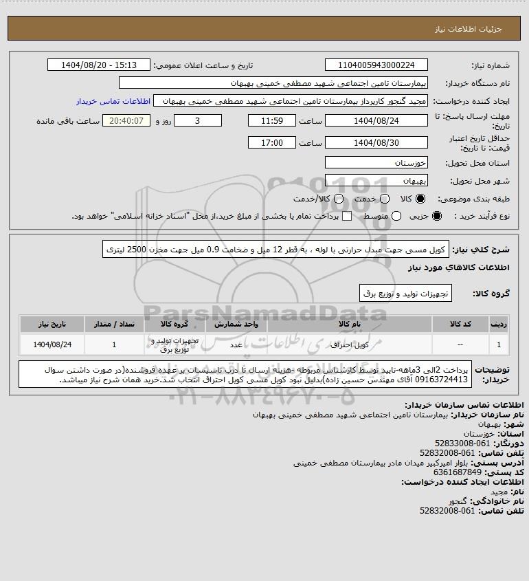 تلفن:5- 88349670 (021) فکس: 88349673 (021) Website: www.ParsNamadData.com E-mail: Info@ParsNamadData.com استعلام کویل مسی جهت مبدل حرارتی با لوله به قطر 12 میل و ضخامت 0.9 میل جهت مخزن 2500 لیتری