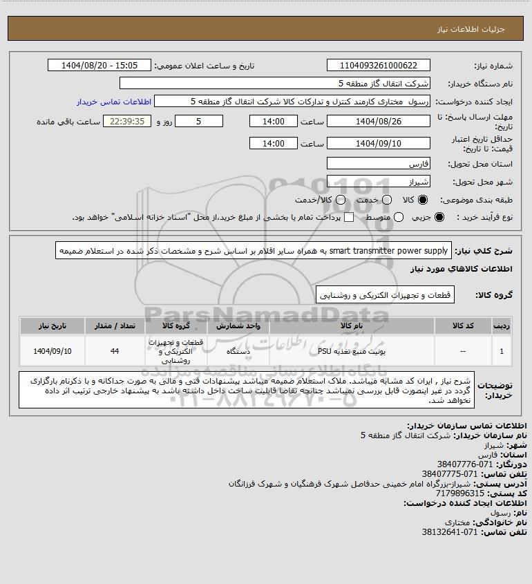 تلفن:5- 88349670 (021) فکس: 88349673 (021) Website: www.ParsNamadData.com E-mail: Info@ParsNamadData.com استعلام smart transmitter power supply به همراه سایر اقلام بر اساس شرح و مشخصات ذکر شده در استعلام ضمیمه