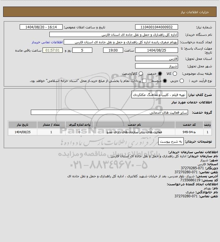 تلفن:5- 88349670 (021) فکس: 88349673 (021) Website: www.ParsNamadData.com E-mail: Info@ParsNamadData.com استعلام تهیه فیلم کلیپ و نماهنگ عکلکردی