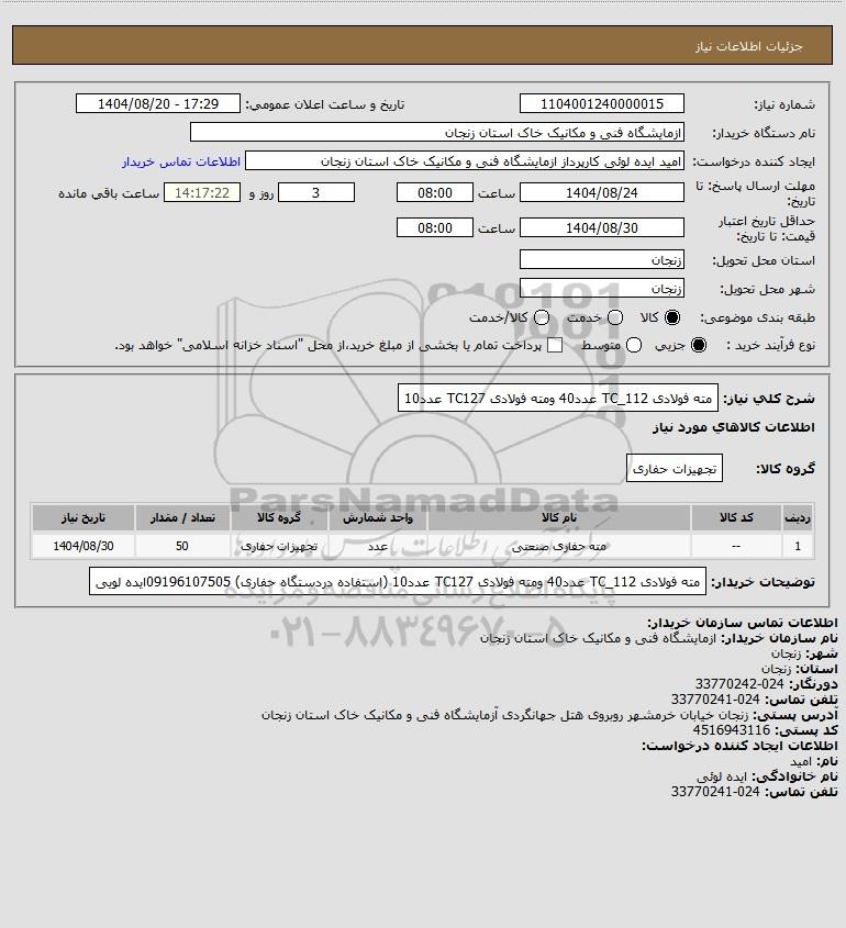 تلفن:5- 88349670 (021) فکس: 88349673 (021) Website: www.ParsNamadData.com E-mail: Info@ParsNamadData.com استعلام مته فولادی TC_112 عدد40 ومته فولادی TC127 عدد10
