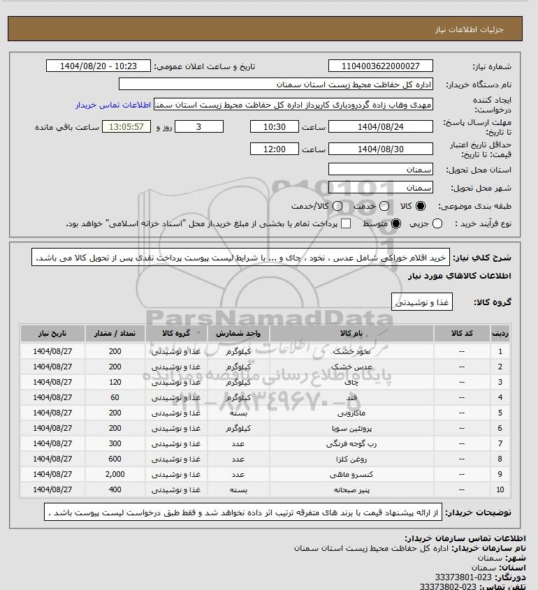 تلفن:5- 88349670 (021) فکس: 88349673 (021) Website: www.ParsNamadData.com E-mail: Info@ParsNamadData.com استعلام خرید اقلام خوراکی شامل عدس نخود چای و ... با شرایط لیست پیوست پرداخت نقدی پس از تحویل کالا می باشد.