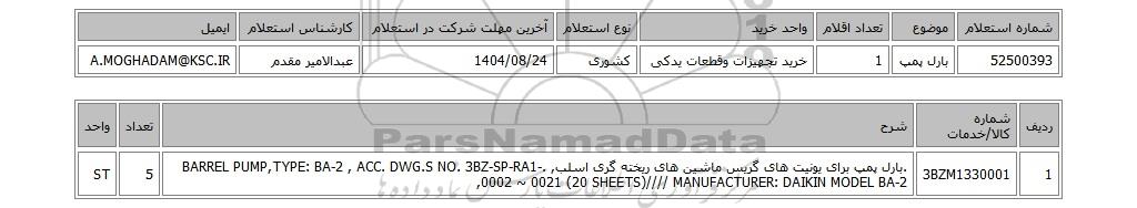 تلفن:5- 88349670 (021) فکس: 88349673 (021) Website: www.ParsNamadData.com E-mail: Info@ParsNamadData.com استعلام بارل پمپ